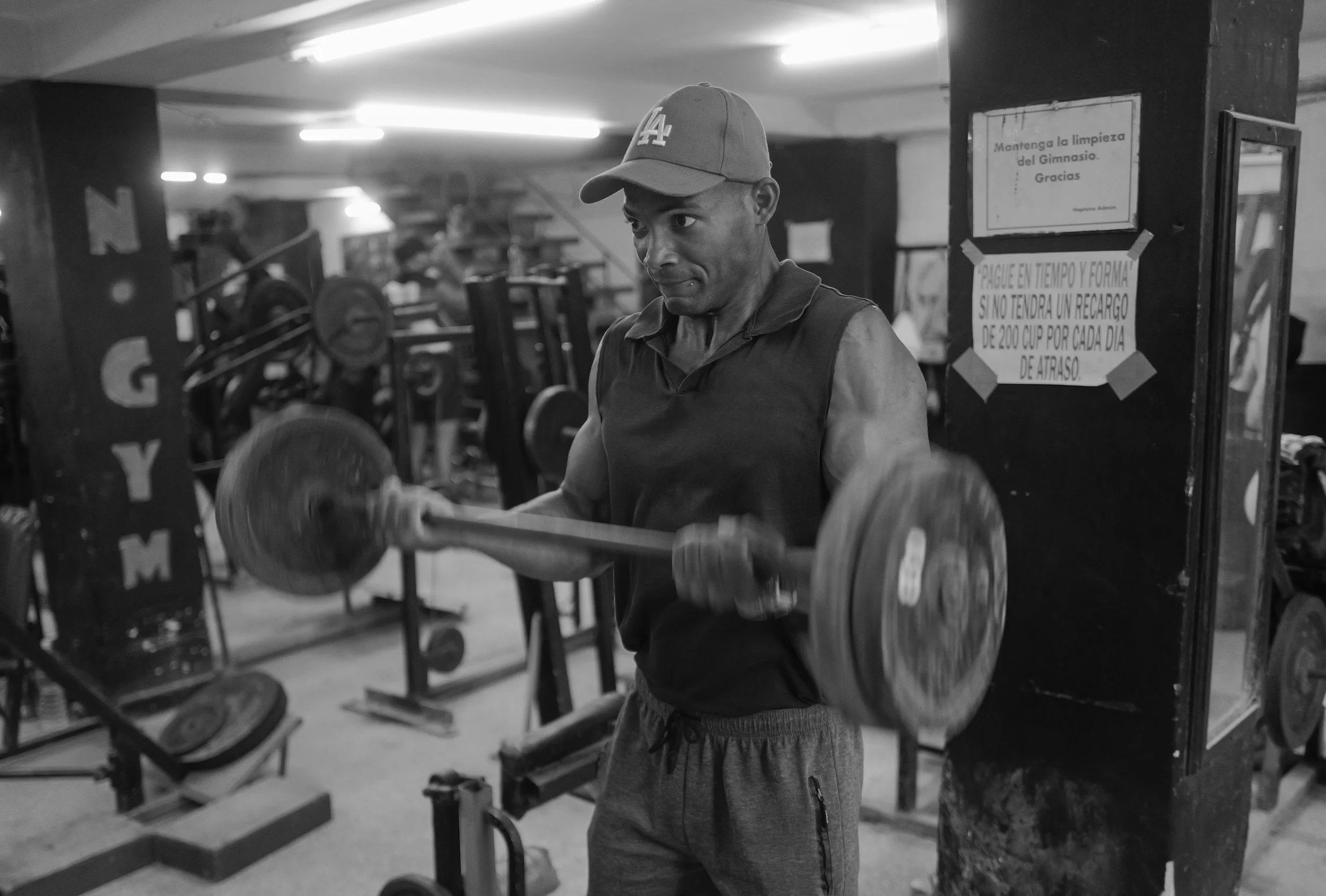 The image that required the most from him technically was made in a gymnasium. The space was small and crowded, the light was low, and the subjects were in constant motion. He used that motion deliberately. A long enough exposure to blur the weights being lifted while keeping the subject's face still. The blur became part of the image rather than a problem to be solved. It is the kind of photograph that requires you to stop fighting the conditions and start working with them.